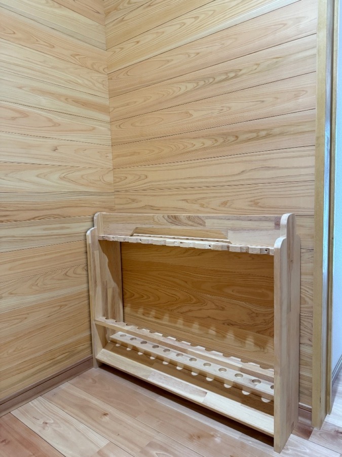 ご主人のご趣味である魚釣り。道具が多くなるため、釣具をまとめて収納できる専用のお部屋をご用意しました。また、数が増えて収納にお困りだった釣竿のために、ロッドスタンドを手作りで製作。使いやすさはもちろん、大切な道具をきれいに保管できる空間となっています。