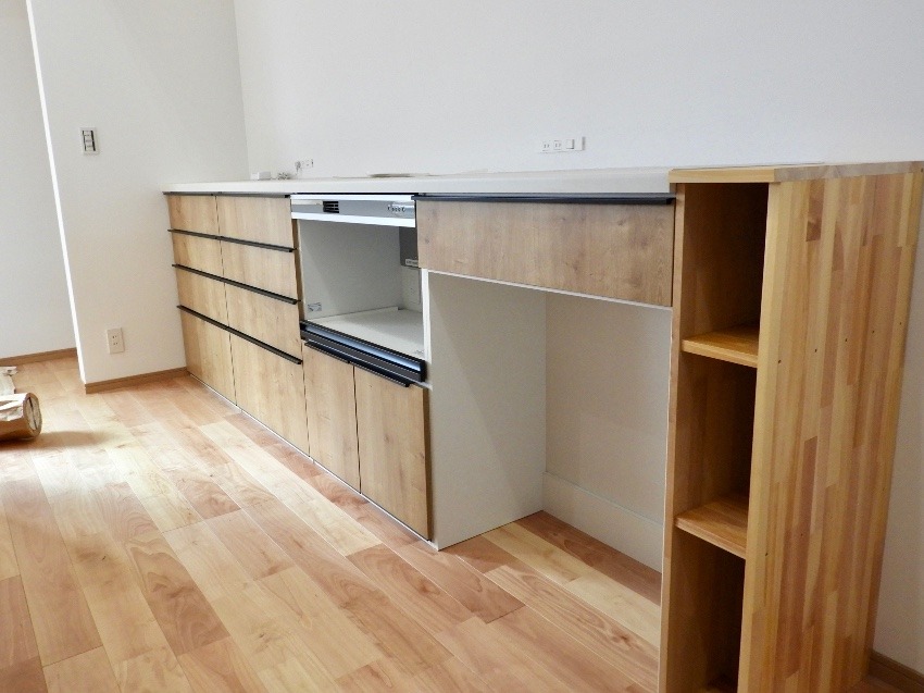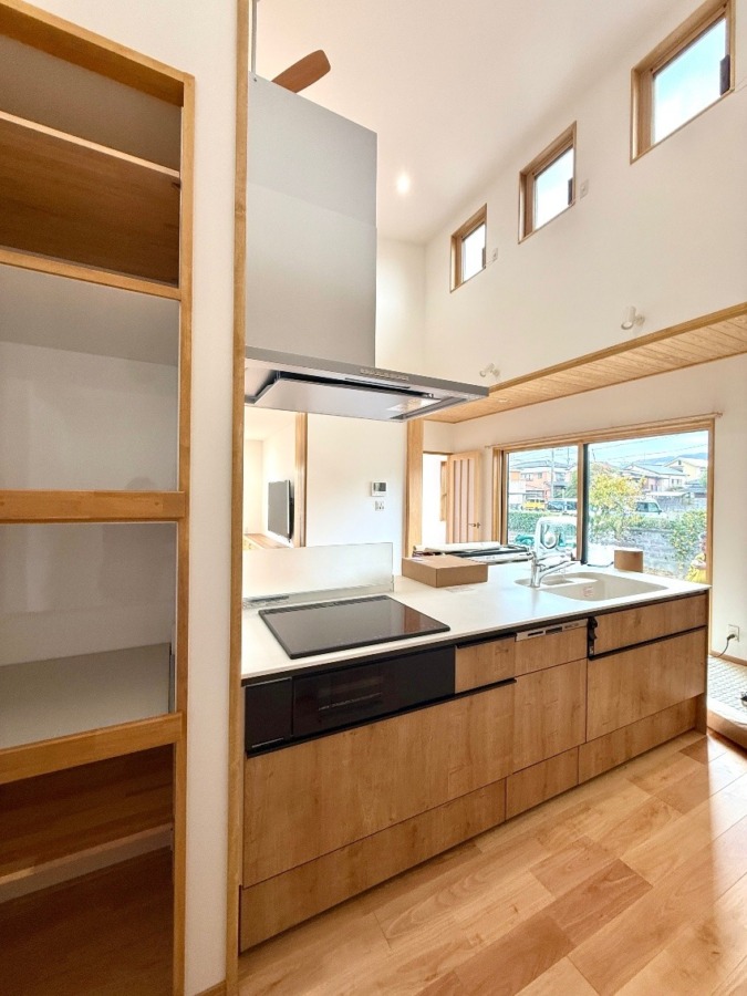 キッチンカウンター後ろのカップボードには、収納力をアップさせる造作棚をプラス。物が増えやすいキッチンだからこそ、こうした「ちょっとした」工夫が、意外と頼りになるポイントです。