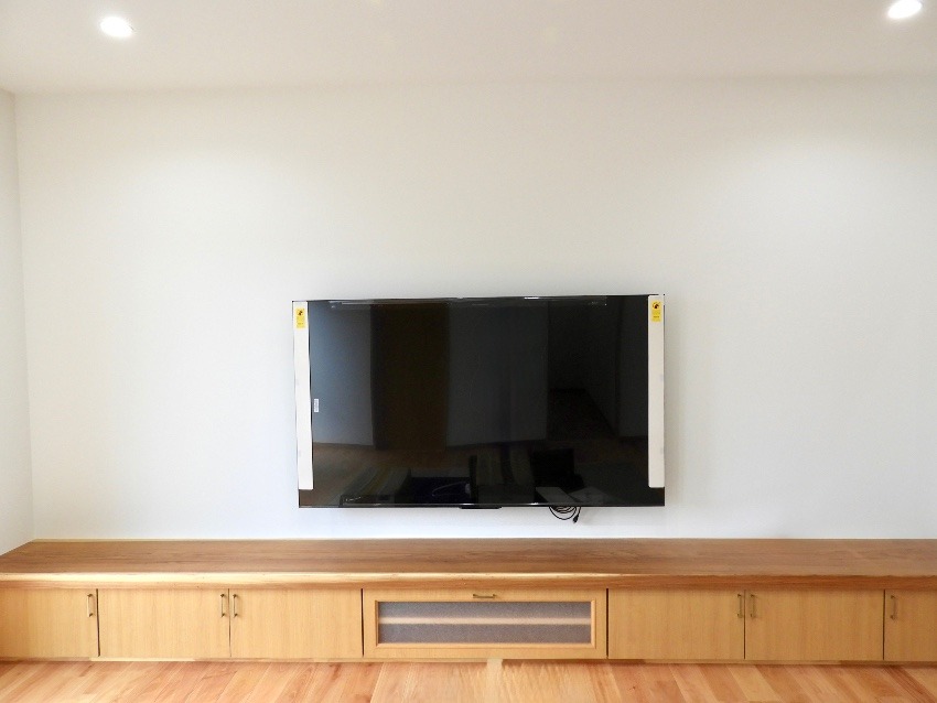 リビングの壁にぴったり納まるように製作したテレビボード。天板には一枚板を使用し、高級感とあたたかみを兼ね備えています。隙間がないため、裏側に埃がたまる心配もありません。このような作り付けの創作家具や建具も、工務店ならその空間にぴったり合わせてお作りすることが可能です。