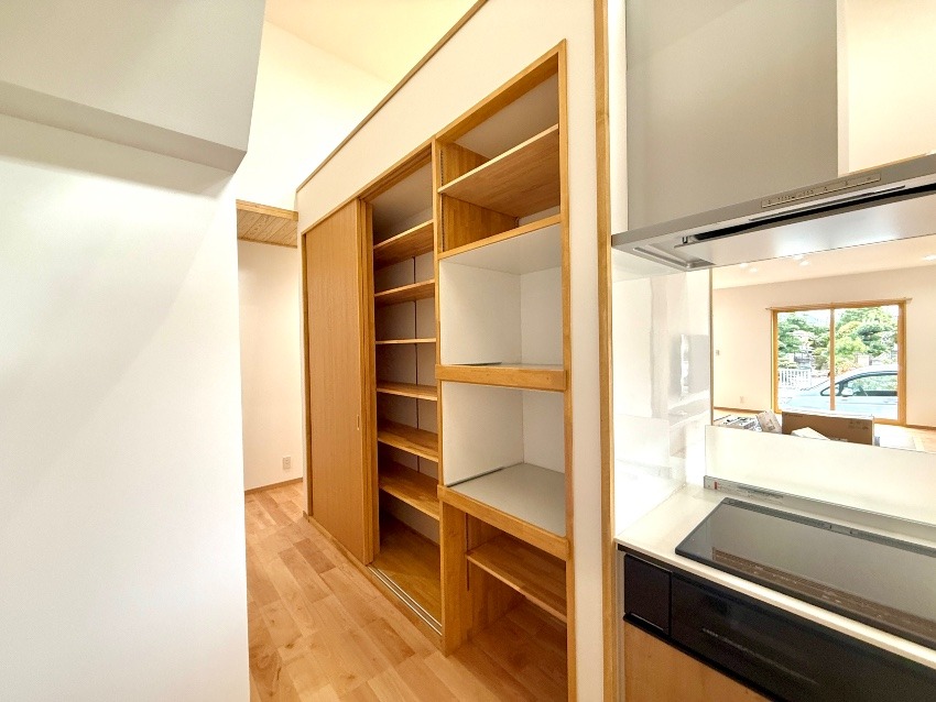 キッチンの左側に大きなキッチンパントリーを設置。食器やストック品、普段あまり使わない調理器具もまとめて収納できます。スライド扉付きだから、目隠しもばっちりです。