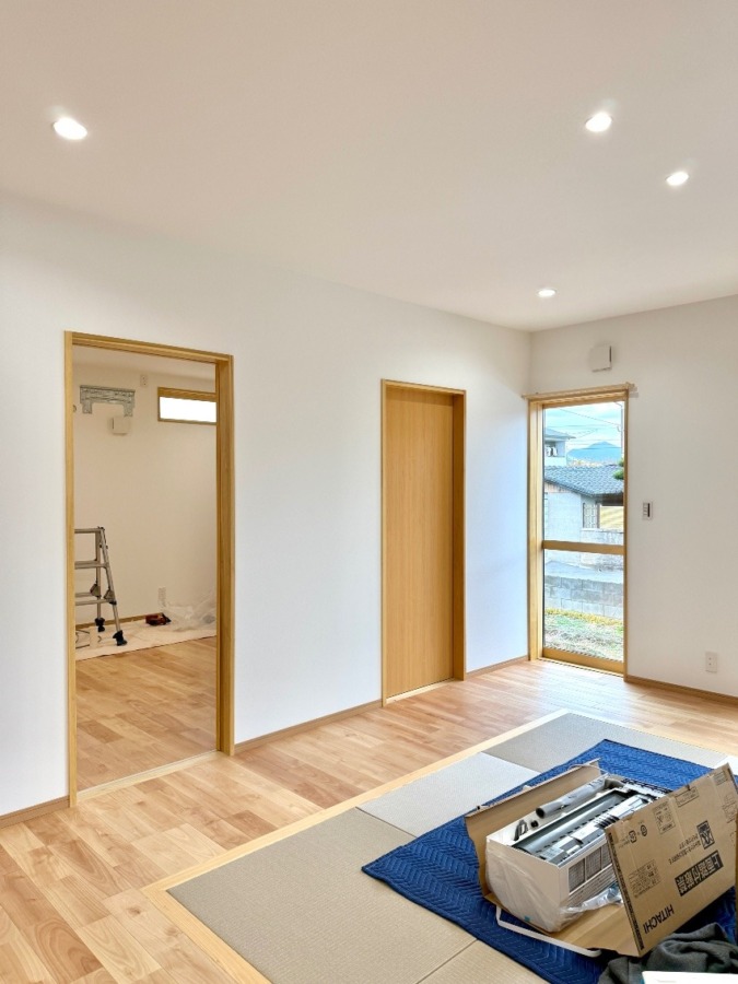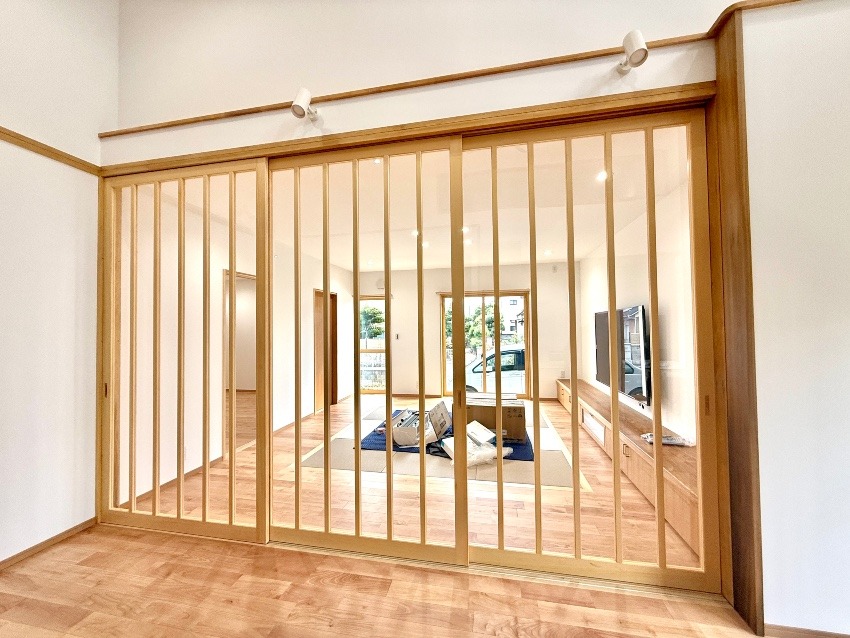 リビングの中央には畳スペースを作って、ほどよく和の雰囲気をプラス。ほっと落ち着く空間で、小さなお子さまの遊び場にもぴったりです。リビングとダイニングの仕切りは、視線が抜けるデザインだから開放感はそのまま。使わないときはスライドで壁に収納できるので、見た目もスッキリです。