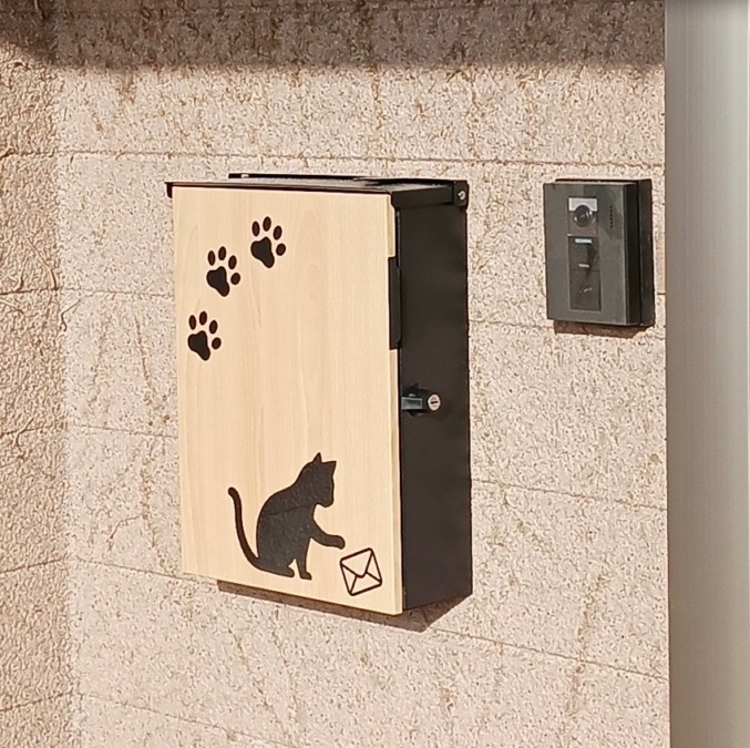 玄関のインターフォン横には、猫のイラストが可愛らしい、大きな郵便物もすっぽり入る郵便受けを設置。外観からも猫ちゃんへの愛情が感じられるおうちです。