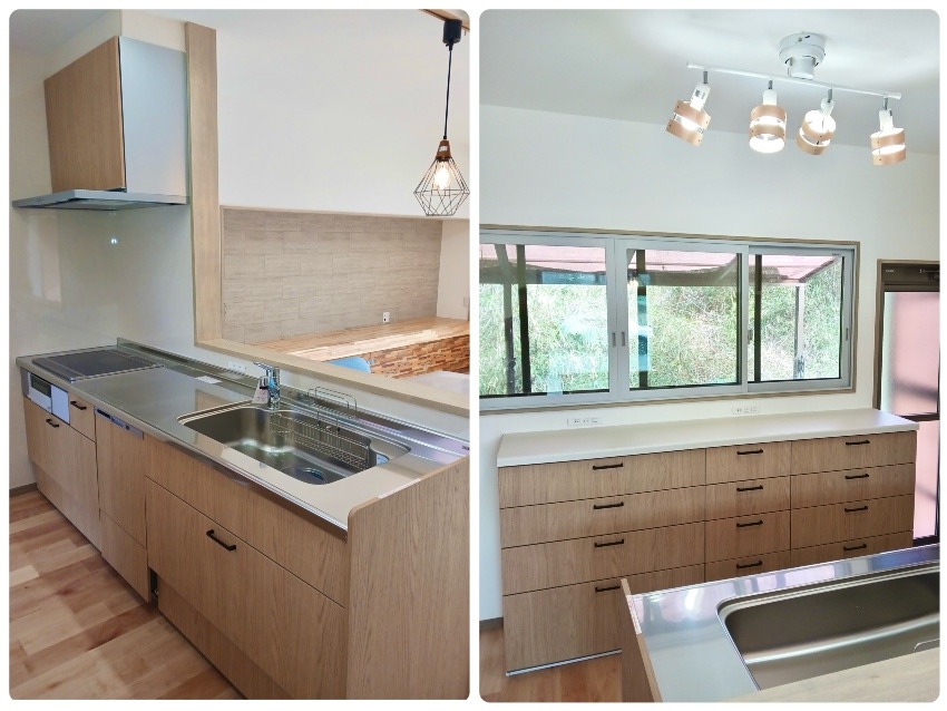 淡いカラーのやさしい木目キッチンを新調しました。コンロは、ご家族みんなが安心して使えるIHに。キッチンに設置した4灯シーリングスポットライトが手元を明るく照らします。カップボード側には、ダイニングからも見える開放的な窓があり、元々あった外の屋根をあえて残すことで、やわらかい自然光が差し込むキッチンになりました。