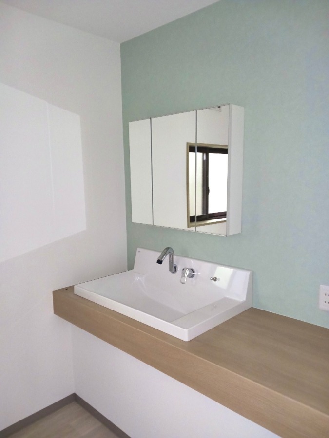 白みがかった木の洗面カウンターと、くすみカラーの壁紙の組み合わせがとてもおしゃれな洗面空間に仕上がりました。真っ白な洗面ボウルが映え、清潔感のある印象に。壁付けタイプの洗面ボウルは床まわりがすっきりし、掃除がしやすいのも魅力です。限られたスペースでも圧迫感なく使えます。