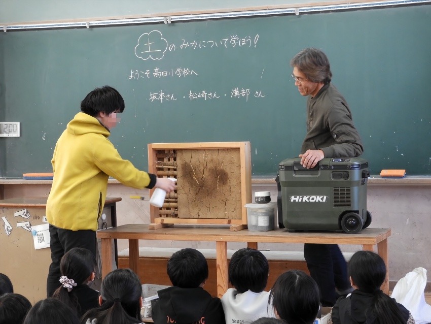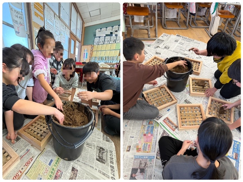 今回、私がもうひとつ嬉しかったことがあります。それは、この制作にあたって、たくさんの重たい荷物を3階まで運び込まなければならなかったときのことです。土は水を含んでいるので、見た目以上に本当に重たいんです。そんな中、6年生の子どもたちが次々と現れて、「一緒に運びます!」と声をかけてくれました。ひとつのバケツを2、3人で力を合わせ、3階まで一生懸命運んでくれる姿に、胸が熱くなりました。授業が終わって片付けをしているときも、先生に言われたわけでもなく、「運びます!」「どこに持っていけばいいですか?」と自然に声をかけてくれて。