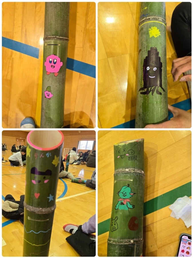 これだ!という自分の竹を選んだら、いよいよアートスタートです。油性ペンやポスカなどの水性ペイントマーカーを使って、貯金箱に絵や文字を描いていきます。子どもたちは好きなキャラクターやスポーツブランドのロゴ、かわいい記号や自分の名前など、自由に描き込んでいきました。「ママ〜ちょっと押さえちょって〜!難しいところ描いて〜!」なんて、親子でわいわい賑やかにアートを楽しむ姿が見られました。そして、ポスカの鮮やかな発色には、思わず感動!竹の落ち着いた色味とのコントラストもきれいに出ていて、ほっとひと安心しました。
