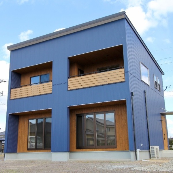 青と木のコントラストが美しい家